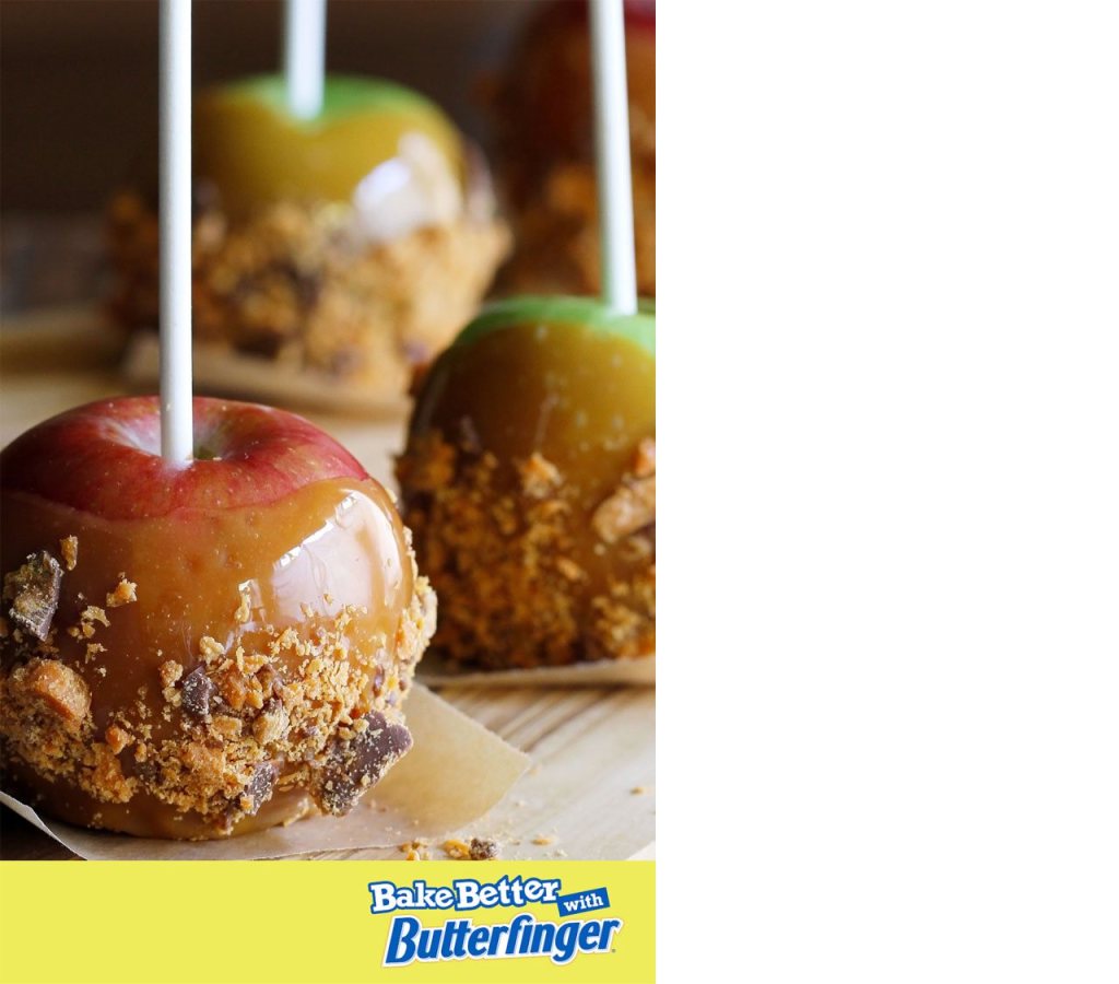 Candy apples are a classic fall food loved by all ages. Crisp, juicy apples paired with gooey sweet caramel get a tasty twist when you add your favorite crushed candy bar as a coating, such as crispety, crunchety, peanut-buttery Butterfingers. After you coat apples in caramel, gently dip or roll in crushed Butterfingers and enjoy!